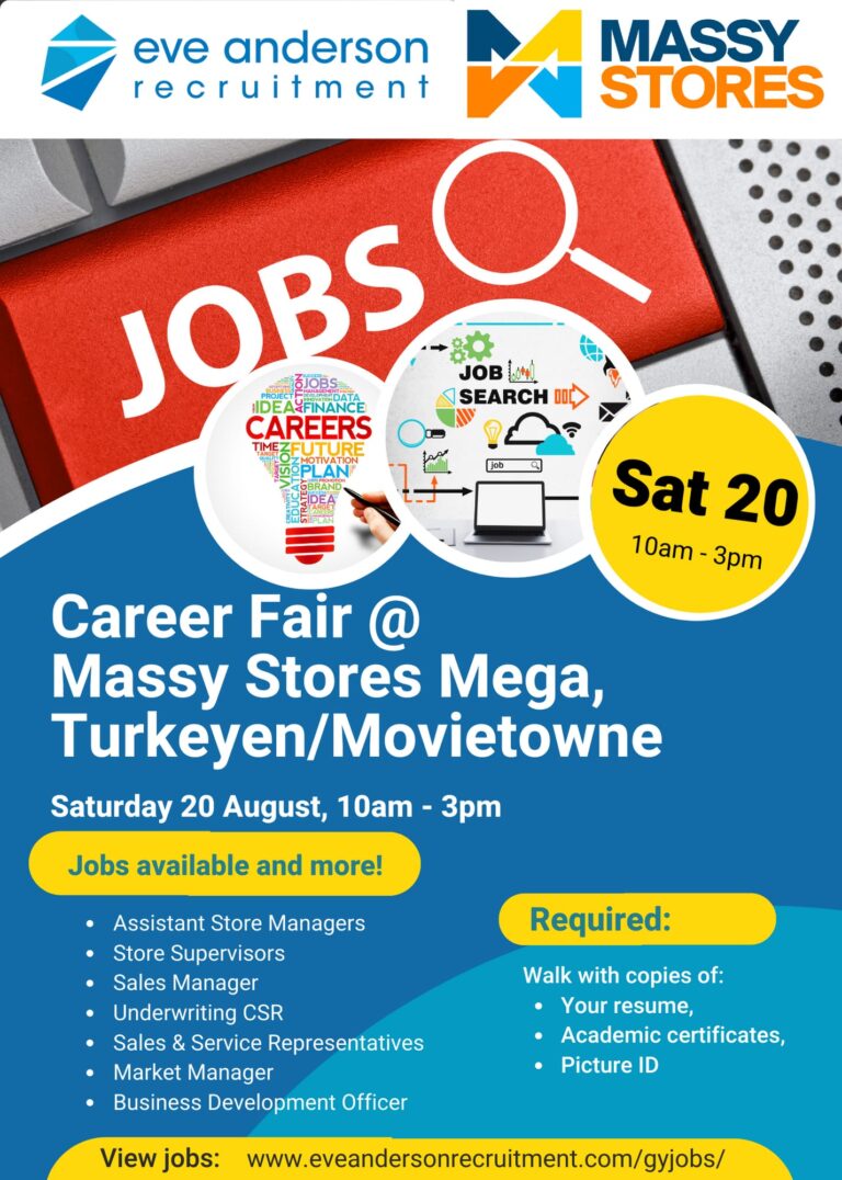 Job Fair this Saturday 20th August 2022 at Massy Mega Store Launch, Turkeyne Movietowne Mall, Guyana